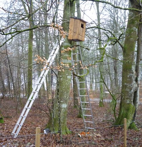 Ska man sätta upp en uggleholk måste man vara minst 2 personer och ha två långa stegar. Annars går det inte.
