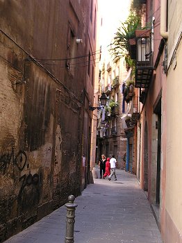 Stadsbild från gamla stan i Barcelona, och något för fotbolls-fans.