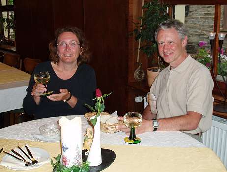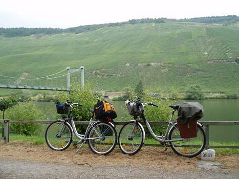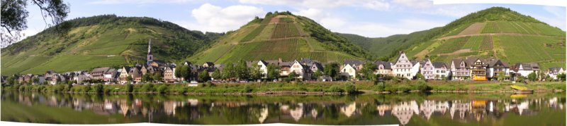 Detta panoramamontage visar en liten by någon timmes cykeltur "nedströms" från Bullay där vi bodde först. Cykelvägarna går ofta nästa floden, och ofta skilt från bilvägarna. Till Bullay var det lätt att komma från den "Frankfurt-flygplats" som Ryan Air flyger till, Hahn. Det är bara att åka ner till dalen med minibuss, och man är strax på plats. Zell och Bullay ligger bäst till, om du vill prova.